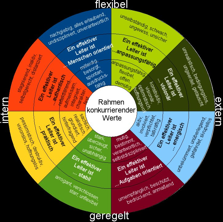 Um ein ganzheitliches Modell der Leitung im Blick zu halten, hilft das Schaubild, „Der Rahmen konkurrierender Werte“.
